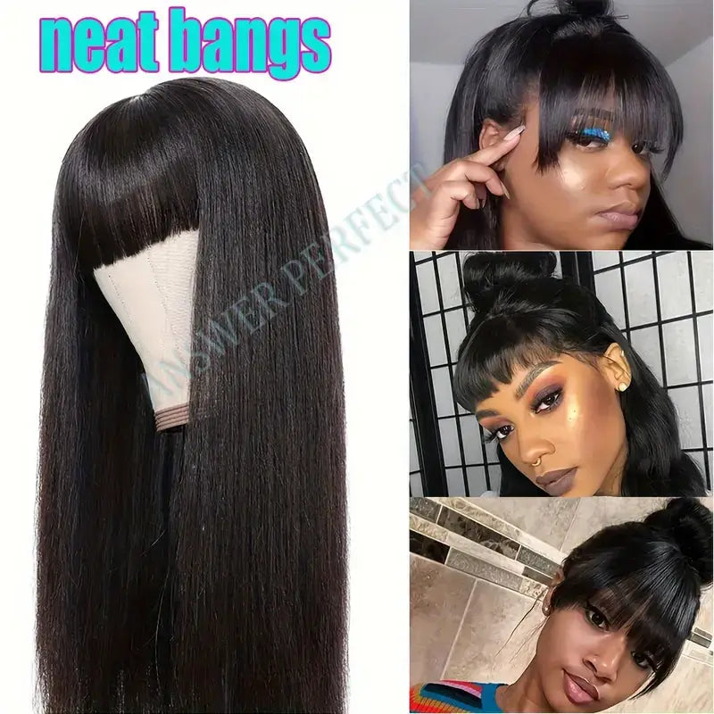 250% Density Brazilian Virgin Straight Human Hair Wig with Bangs - Glueless Machine-Made Lace Front Wig for Women, Natural Color, and Elegant Style