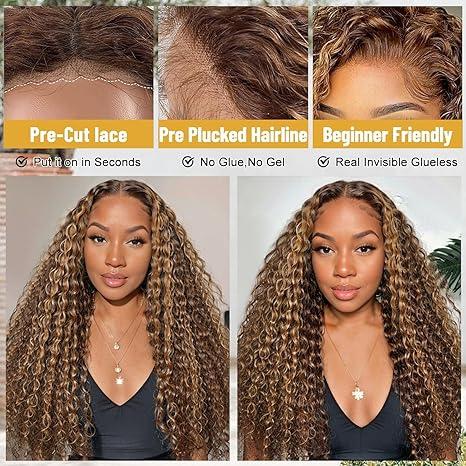 Beluck Hair 6X13 Glueless Deep Wave Wigs 300% Density Human Hair with Drawstring Curly Wave Wigs Closure Wigs 4/27 Pre Plucked Pre Cut Pre Bleached Wear and Go Wigs Outdoorfun Party Vacation Wigs