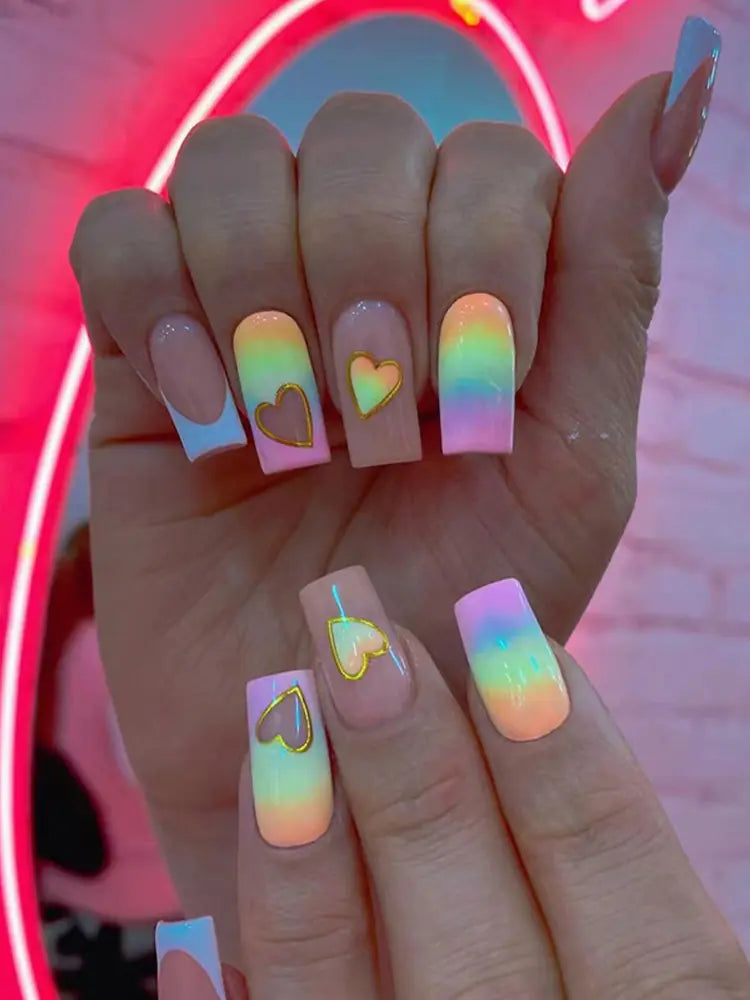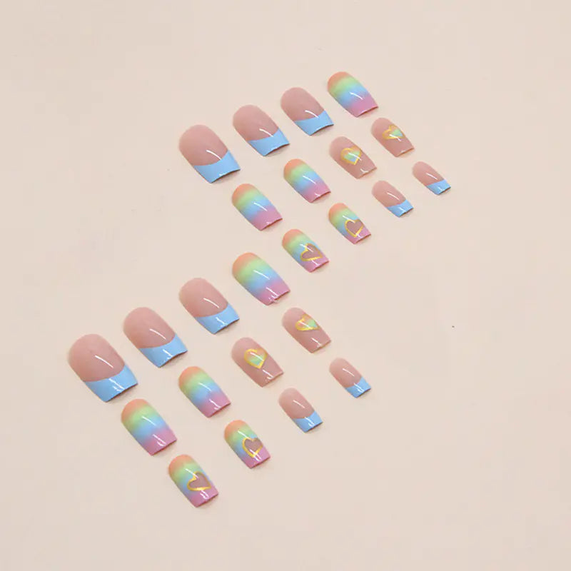 Transform your nails into a vibrant masterpiece with our Love Rainbow Nail collection! These medium-length square fake nails feature a cute natural sweet design that is perfect for those who want to add a pop of color to their look. The gradient rainbow effect beautifully blends hues, making your nails stand out in any setting.